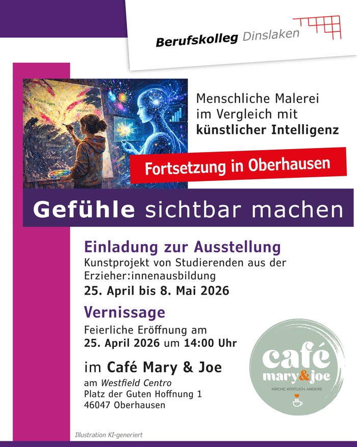 Eine Kunstausstellung von Studierenden aus der Erzieher:innenausbildung am Berufskolleg Dinslaken im Café Mary & Joe vom 25. April bis 8. Mai 2026.