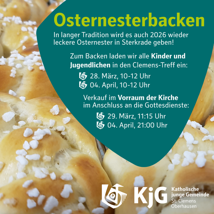 Die frisch gebackenen Osternester werden nach den Gottesdiensten am 29. März um 11:15 Uhr sowie am 04. April um 21:00 Uhr im Vorraum der Kirche gegen eine Spende verkauft. Damit unterstützt Du direkt unsere Kinder- und Jugendarbeit in Sterkrade.