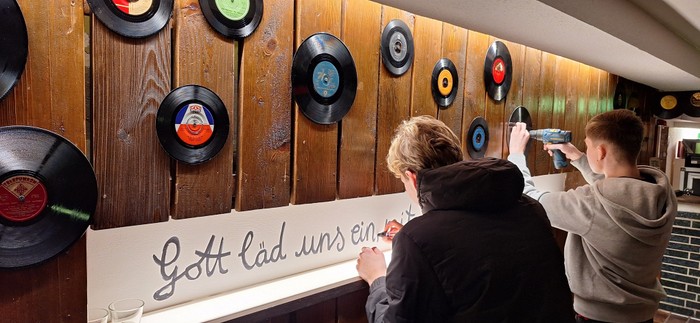 Um sich wirklich intensiv mehrere Tage lang mit der Motivauswahl und der Umsetzung beschäftigen zu können, wurde die erste Woche der Osterferien ausgewählt. Rechtzeitig zur Begegnung am Lagerfeuer am Karsamstag auf der benachbarten Barbara Wiese, sind alle Frontseiten fertig geworden. Glücklich und Stolz auf das erreichte, wurde im Partykeller der Musik der 80er Jahre der Projektschritt gefeiert.